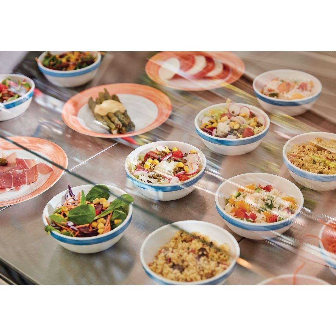 Arcoroc Brush dessert plates stand out with their distinctive design, featuring broad coloured “brush strokes” around the rim that contrast with the white surface of the plate. This use of colour is especially practical in healthcare environments, where it can help with food zoning or identifying different dietary requirements.