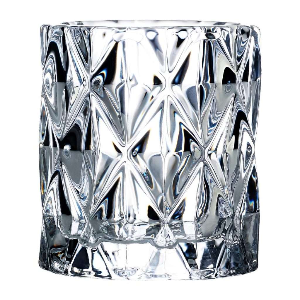 Striking clear-cut glass designs refract candlelight for warm effect