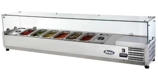The Atosa VRX1600/380 is glass fronted topping well with a capacity of 7 x 1/3 GN pans (150mm deep).