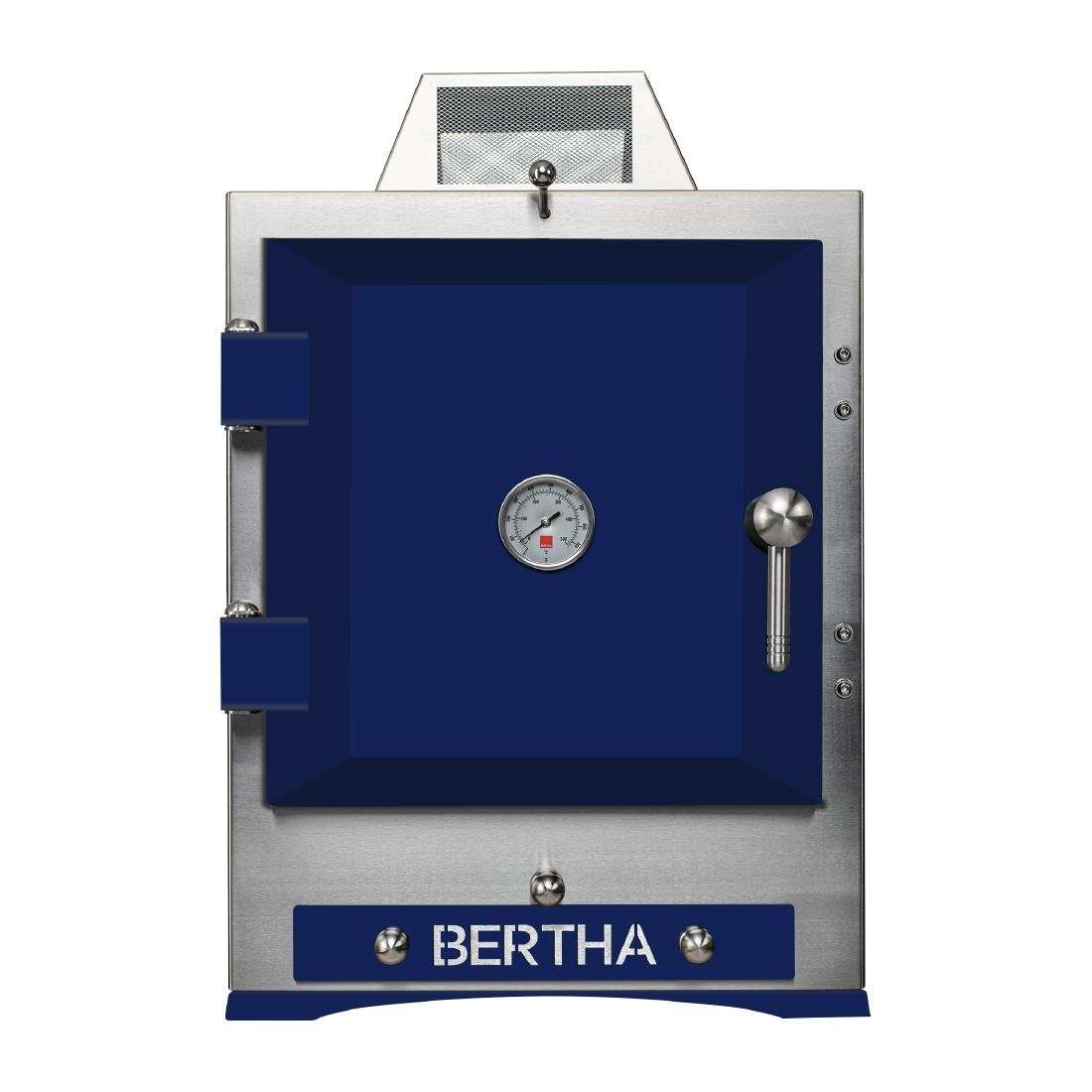 The Bertha Original Table Top Charcoal Oven in dark blue is perfect for outdoor cooking and professional catering. With a generous capacity featuring six shelf runners and 11 rack settings, it cooks meats, fish, and vegetables efficiently. Enjoy precise temperature control with dual bottom air vents and a rapid fire-up time of 30-40 minutes. Constructed for safety with a fire break and hat, it includes a grease tray for easy cleaning and a front-mounted thermometer for accurate cooking.