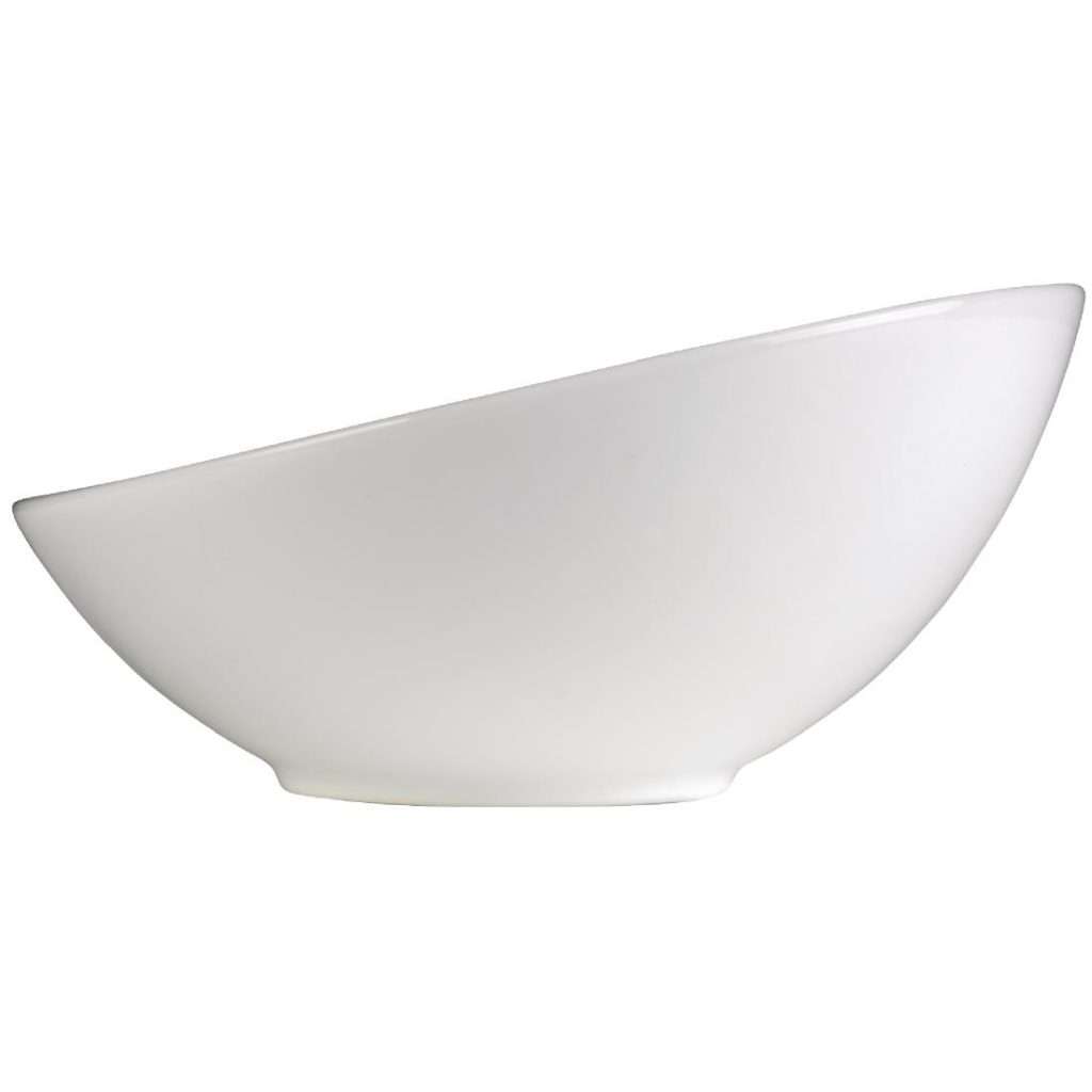 Churchill Art de Cuisine Large Slanted Bowls are perfect for serving salads, pasta, or desserts. Made from durable porcelain, each bowl holds 28oz (796ml) and comes in a convenient pack of six. Weighing 2.75kg, these bowls combine lightweight design with robust quality, making them ideal for both home and commercial use. Their elegant slanted shape enhances presentation, making every meal more appealing. These versatile bowls are a practical choice for any dining setting.