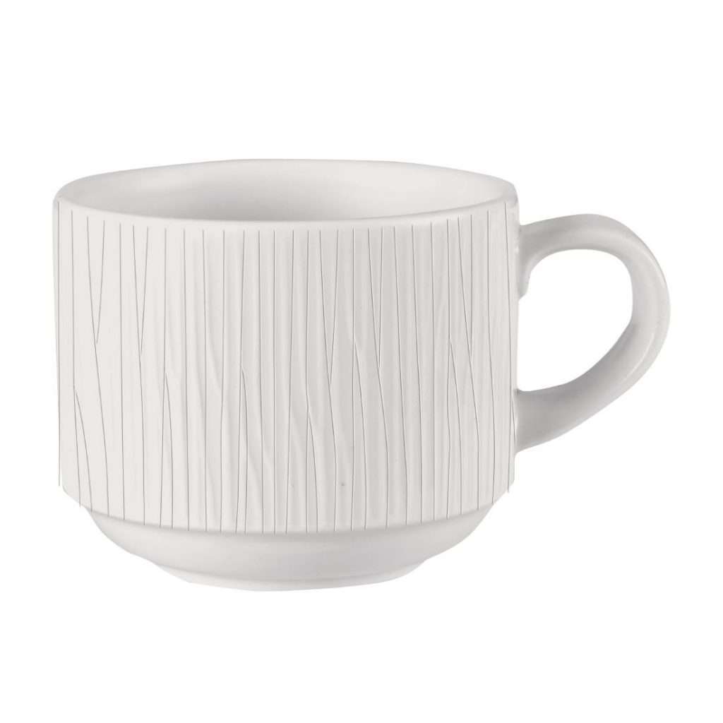 Shop the Churchill Bamboo Stacking Cup, perfect for restaurants or home use. Made from durable super vitrified porcelain, each cup holds 236ml (8oz) and comes in a convenient pack of 12. The artistic bamboo texture adds a unique touch to your table setting while ensuring easy stacking and storage. These cups are designed for commercial dishwashing and microwaving, making them practical for everyday use. Enhance your dining experience with this stylish and functional crockery.
