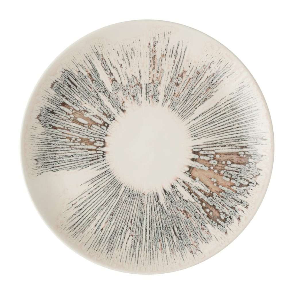 Churchill Lyra Pink Evolve Coupe Plates (288mm, 12 Pack) feature a bold starburst design that improves your dining experience. Made from durable Super Vitrified material, these plates resist thermal shock and breakage while retaining heat effectively. Each plate is unique, thanks to an innovative print process, and is finished with a high-performance ecoglaze for stain and metal mark resistance. Weighing 279g and stackable for easy storage, these plates are microwave and dishwasher safe.