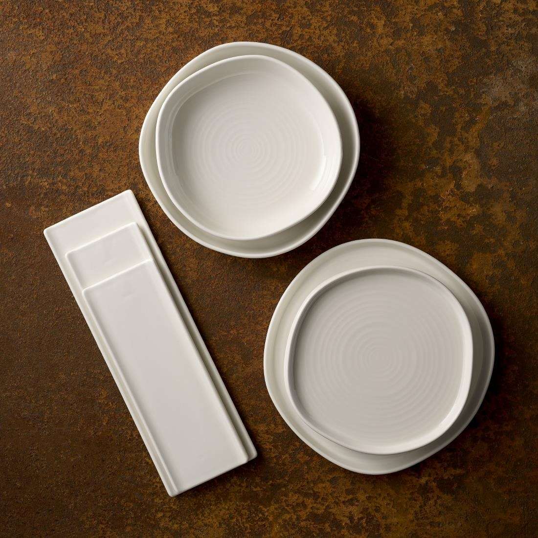 These contemporary oblong plates from Churchill provide the perfect canvas for showcasing your culinary creations. Their design features an organic walled edge and a concentric embossment that is reminiscent of hand-thrown pottery.