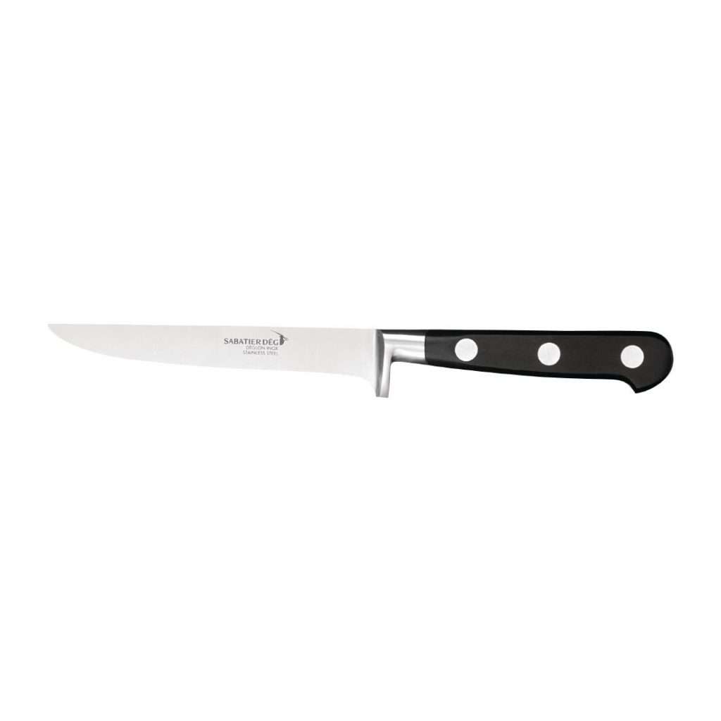 The Deglon Sabatier Boning Knife features a 12.5cm stainless steel blade, perfect for precise trimming and deboning. Weighing just 100g, it offers a comfortable grip and excellent control, making it ideal for chefs and home cooks alike. This durable knife is designed for everyday use in the kitchen, ensuring efficiency and accuracy in food preparation. Upgrade your culinary tools with this reliable boning knife.