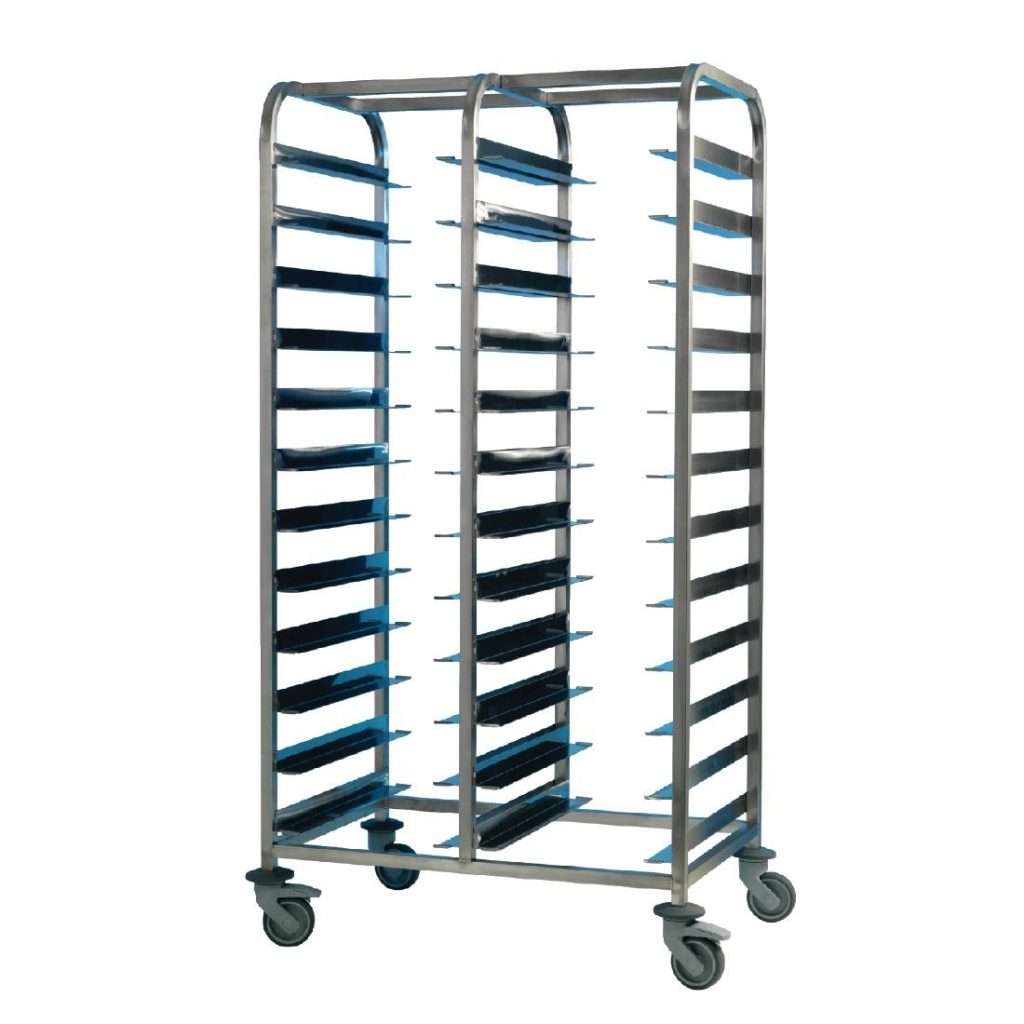 Stainless steel clearing trolley with 24 trays, designed for efficient food service in catering environments. Weighing 38.5kg, it features durable braked castors and bumper protection for safety. Perfect for streamlining your clearing process, this trolley is supplied fully assembled for immediate use. Organize and transport dishes with ease, making it a reliable addition to your kitchen or dining area.