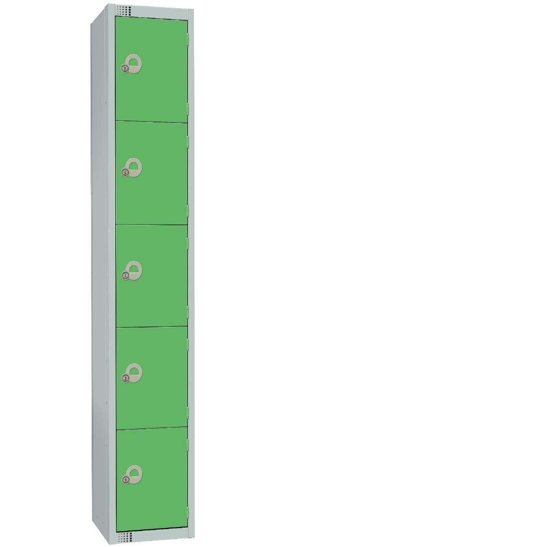 Shop the Elite Five Door Camlock Locker with Sloping Top in Green, designed for durability and security. Made from powder-coated steel, it weighs 26kg and offers ample storage for personal items. With inter-compartment security and a sloping top for easy cleaning, this locker fits seamlessly in schools, gyms, or workplaces. It features five individual compartments, ensuring organized storage for everyone. Ideal for shared spaces, it combines functionality with a sleek design.