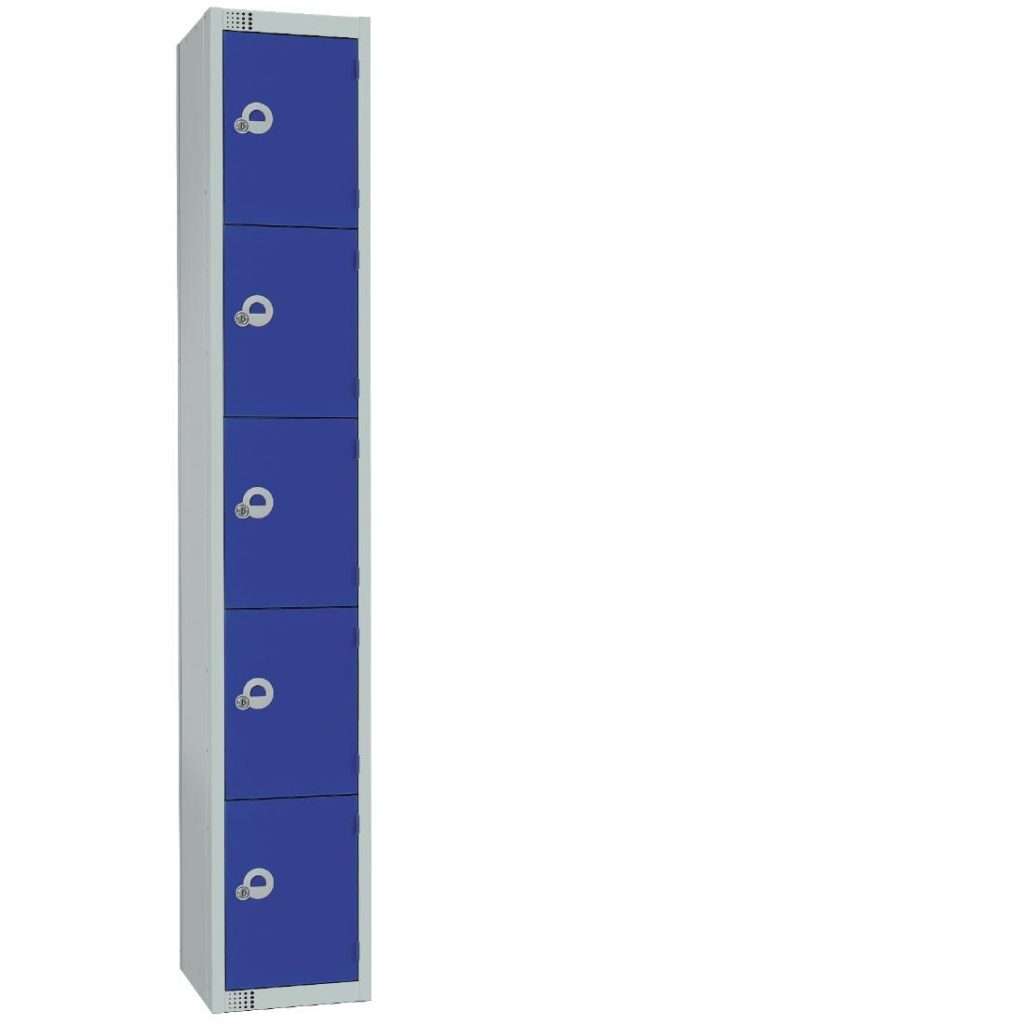 Shop the Elite Five Door Padlock Locker with a sloping top in blue, designed for durability and security. Made from tough epoxy polyester powder-coated steel, it weighs 26kg and features inter-compartment security with a welded plinth. Each locker provides ample storage for personal items, perfect for schools, gyms, or workplaces. With a depth of 450mm, it combines functionality with a sleek design. Keep your belongings safe and organized in this reliable locker solution.