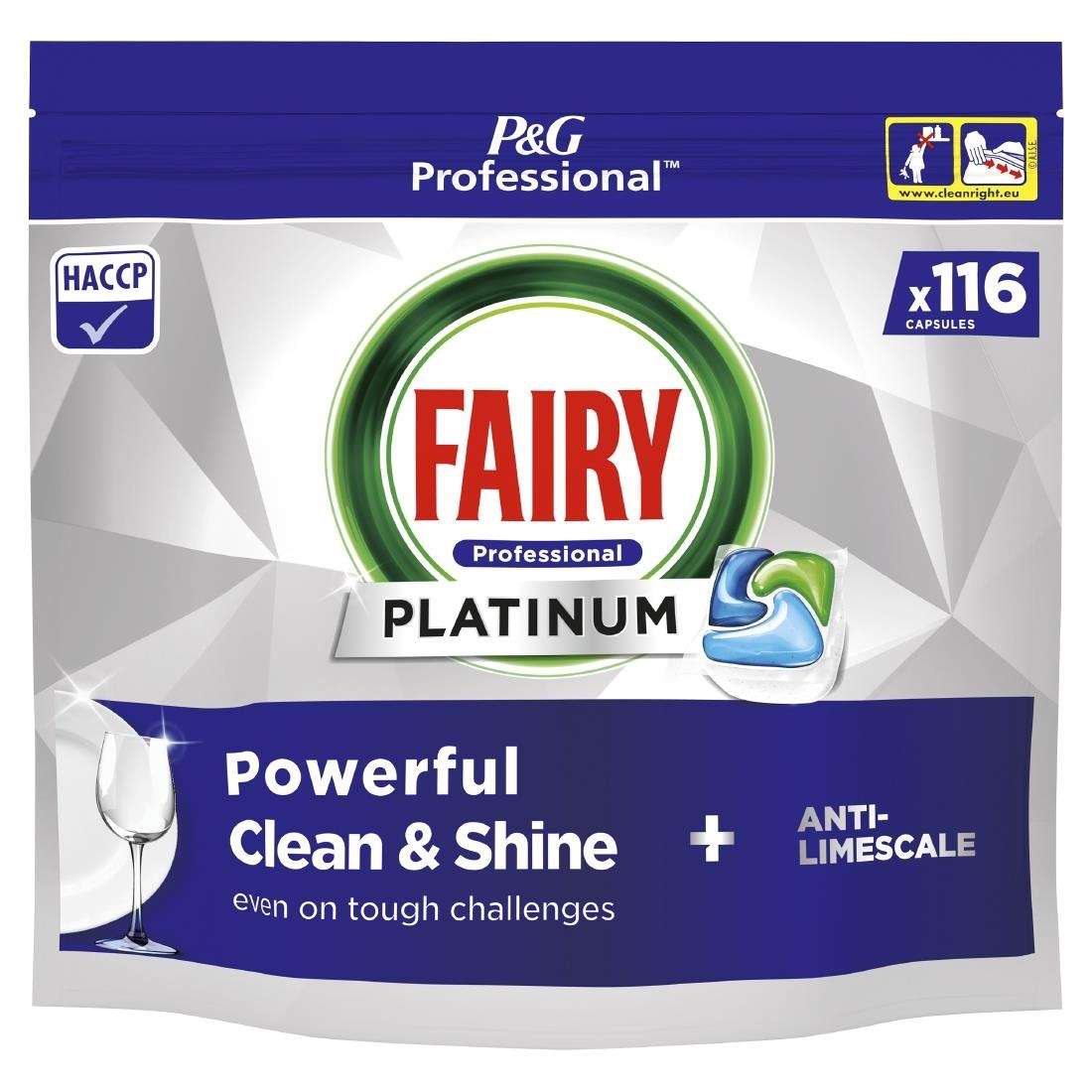 Fairy Professional Platinum Dishwasher Capsules are designed for commercial use, delivering powerful cleaning in every wash. Each of the 116 capsules in this two-pack features a concentrated formula that tackles tough grease while protecting glassware and silverware with built-in salt and rinse aid action. The ultrasoluble pouches dissolve quickly, ensuring immediate action against stubborn residues. Ideal for maintaining a clean dishwasher, they help prevent limescale and grease build-up.