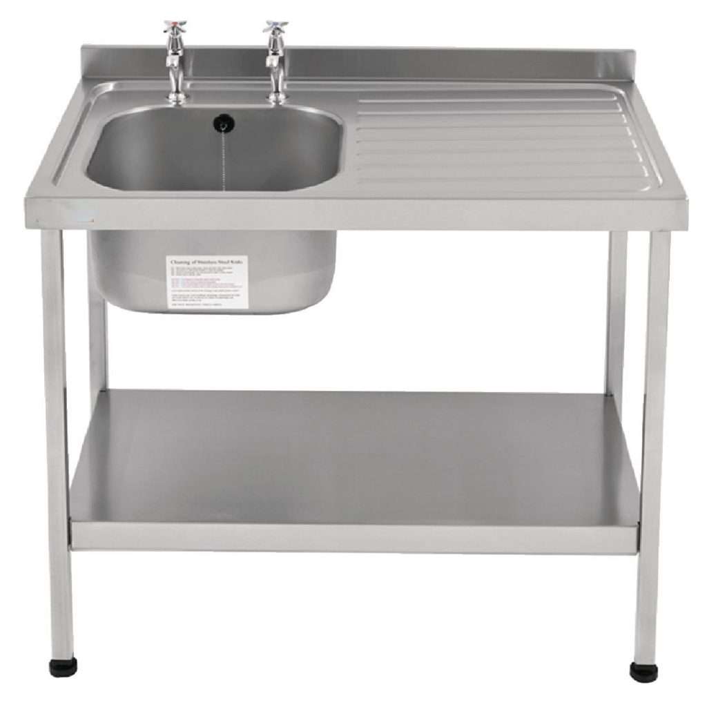 Stainless steel sink with right hand drainer, perfect for kitchens and utility rooms. Made from durable 304 stainless steel, it measures 1200x600mm and weighs 13kg. Features inclined drainers for effortless cleaning and comes with a stand, shelf, taps, and waste for easy self-assembly. Standing height is 900mm, making it suitable for various setups. This sink combines practicality and style for everyday use.
