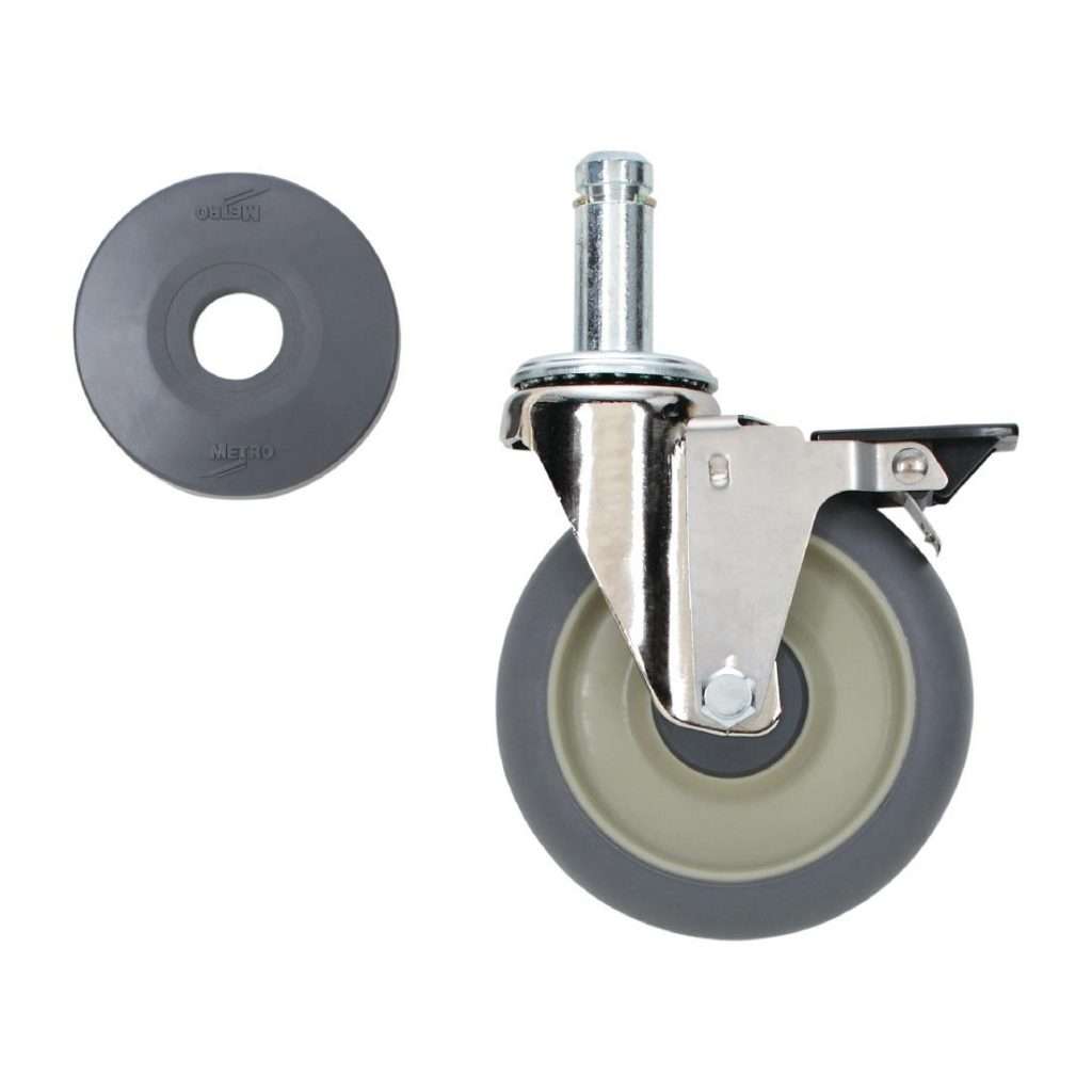 Metro Castors for Super Erecta Series provide durable mobility with rubber wheels that glide smoothly. This pack of 4 castors supports easy movement of shelving units, making your kitchen or storage area more efficient. Each castor weighs 910g and is designed for stability and safety with a reliable brake feature. Ideal for modular shelving systems, these castors ensure your items stay securely in place while allowing for flexible arrangements.