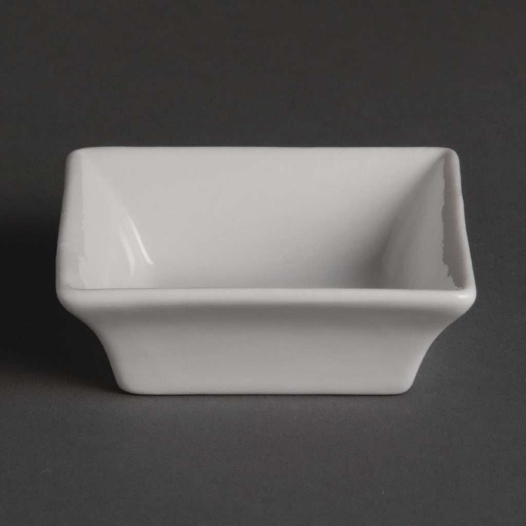 This miniature square dish from Olympia is designed to provide a great value and hardwearing porcelain crockery solution for single bites and dips. Strengthened rolled edges ensure the dish is chip resistant and the fully vitrified body gives great glaze durability, making it ideal to withstand the rigours of the professional catering environment. The dish is oven, microwave, dishwasher and freezer proof.