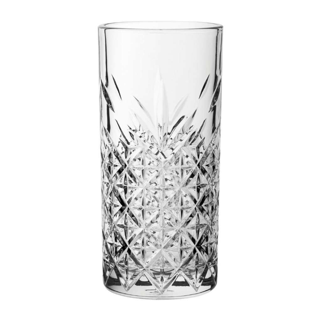 Classic styling meets robust practicality with the Pasabahce Timeless Vintage long drink glass. The glass offers the look and feel of traditional cut crystal with a textured “cut glass” finish, yet is machine made from clear glass for enhanced durability in busy hospitality settings. The 300ml capacity makes it ideal for serving various beverages, including cocktails, soft drinks, juice and water.