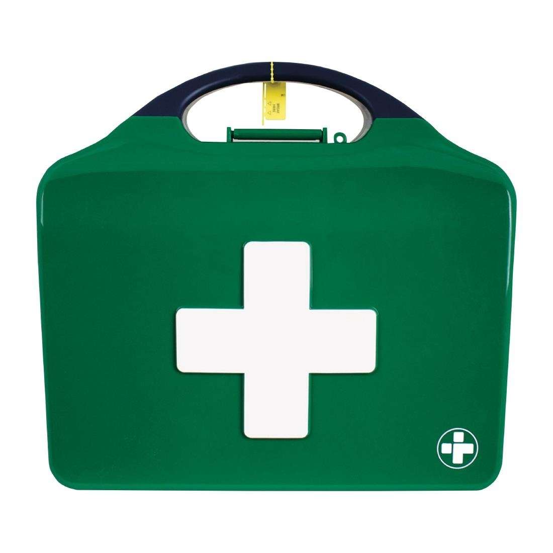 The medium workplace kit includes all the essentials needed for a low risk environment with 25-100 employees or a higher risk setting with 5-25 employees. Inside, you’ll find 2 conforming bandages, 3 triangular bandages, 2 burn dressings, 3 eye pad dressings, 3 finger dressings, 4 HSE medium sterile dressings, 3 HSE large sterile dressings, 2 adult foil blankets, 9 pairs of nitrile gloves, a guidance leaflet, 60 assorted washproof plasters, 1 resuscitation face shield, pair of scissors, 2 rolls of microporous tape and 30 cleansing wipes.