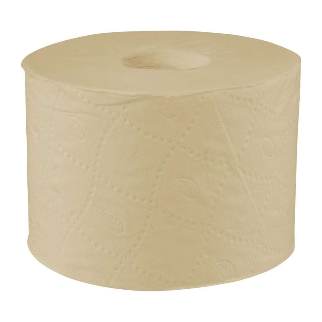 Tork OptiServe Coreless Toilet Paper is a sustainable choice, made from 100% recycled fibres. Each 2-ply roll features a perforated design for a soft feel and wraps-free format to minimize waste. With three times more paper than standard rolls, it ensures fewer refills, making it ideal for high-traffic areas. The natural light-brown color comes from recycled materials, blending functionality with eco-friendliness.
