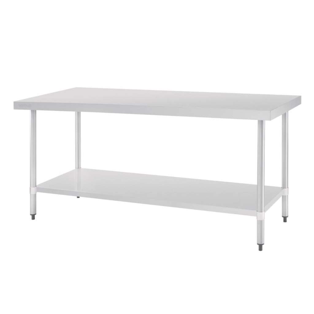 Vogue Stainless Steel Prep Table 1800mm offers a sturdy workspace for any kitchen. Made from durable 430 stainless steel, it combines practicality with reliability. Weighing 38.1kg, this table is height adjustable and features a galvanised steel undershelf for added storage. Perfect for food prep, it provides a stable surface for your culinary tasks. Enhance your kitchen efficiency with this essential piece.